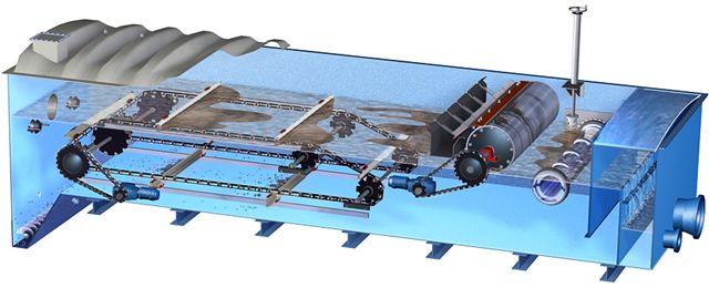 我們最普通的刮泥機設計是使用一個四軸的鏈條和刮板的收集裝置。在此布局中,刮板在鏈條的傳動下繞4組軸和鏈輪運轉,有2組在近池頂,有2組在底部。刮板持續(xù)不斷的運轉把水面的浮油撇到分離器的出水端。當刮板到達池體末端的時候,就會向底部運轉,同時在此處把污泥送入池體進水端的漏斗。